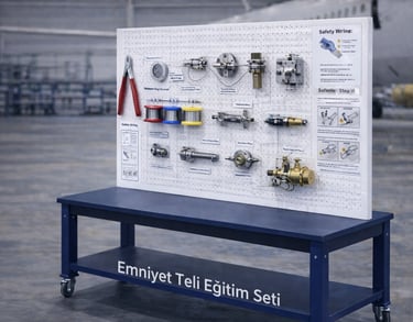Emniyet Teli Eğitim Seti, hava araçlarında kullanılan mekanik bağlantı elemanlarının gevşemeye karşı emniyete alınmasında kullanılan emniyet teli (safety wire) uygulamalarının prensiplerini, tekniklerini ve bakım prosedürlerini uygulamalı olarak öğretmek amacıyla tasarlanmış modüler bir havacılık eğitim platformudur. Set; farklı çap ve tipte emniyet telleri, emniyetlenecek bağlantı elemanları, kilitleme noktaları ve uygulama örneklerini içeren bileşenlerden oluşur. Bu sayede öğrenciler, havacılık bakımında kritik öneme sahip emniyetleme yöntemlerini gerçekçi bir donanım üzerinde öğrenebilmektedir.