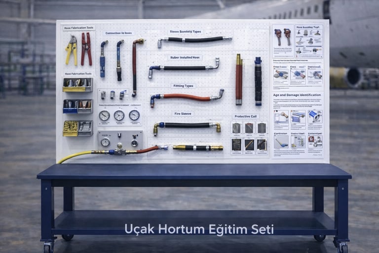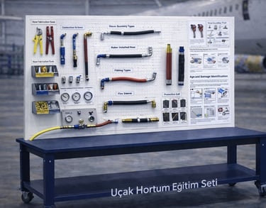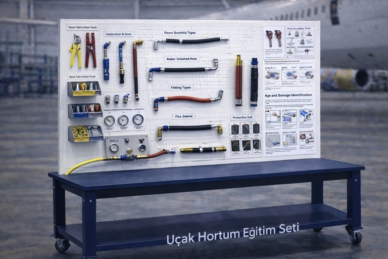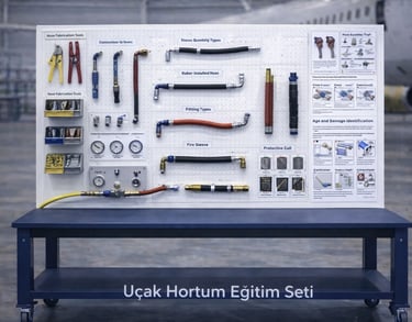 Bu eğitim seti, bakım personelinin hortum seçimi, bağlantı teknikleri, montaj ve kontrol işlemlerini standartlara uygun şekilde gerçekleştirme becerisini geliştirmeyi hedefler; böylece hava aracı akış hatlarında emniyet, sızdırmazlık ve sistem güvenilirliğinin sağlanmasına katkı sunar.